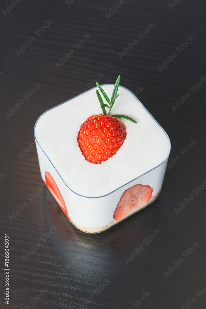 Strawberry shortcake on a black wooden table in cafe coffee shop.