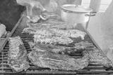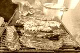 A rack of ribs of meat being grilled over hot coals, while a cook handles it with metal utensils.