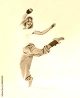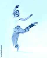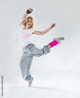 Young beautiful slim girl dancing on a white studio background