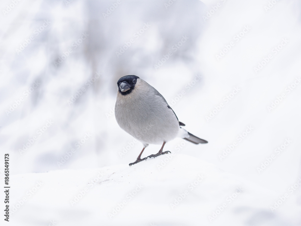 Baikal bullfinch are perching on snow surface