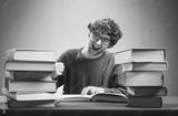 Excited man reading a book, studying