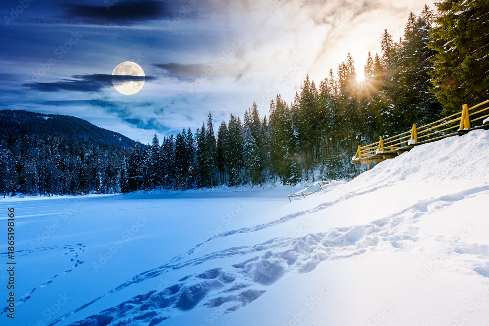 snow covered frozen lake in natural park. day and night time change concept. winter solstice landscape surrounded with coniferous forest in mountains with sun and moon. harmony and progress calendar