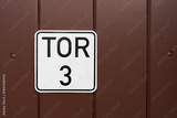 Schild an einer braunen Holztür mit der deutschen Aufschrift Tor 3