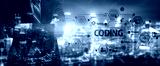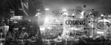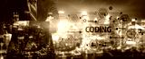 A confident programmer stands with arms crossed in front of a dynamic coding interface overlayed against a vibrant city skyline, symbolizing modern technology and innovation. Tessel