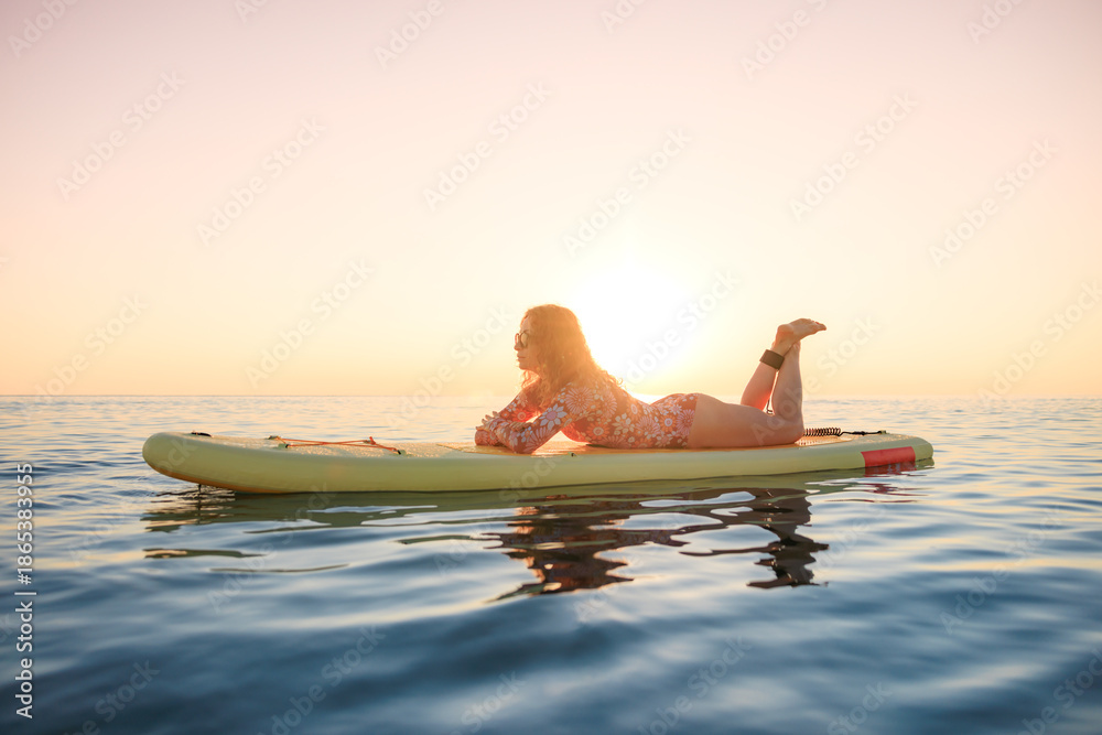 Young woman walking on stand up paddle sup boards by the sea during summer vacation