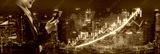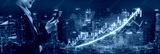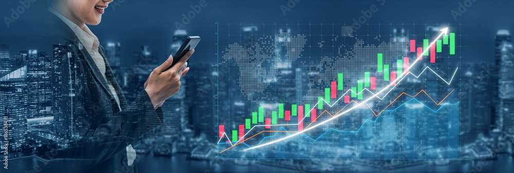 A confident businesswoman checks stock market data on her smartphone, surrounded by a vibrant city skyline at night. Financial graphs illustrate market trends. Impute