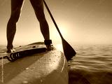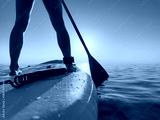 Young woman walking on stand up paddle sup boards by the sea during summer vacation
