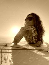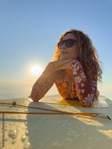 Young woman walking on stand up paddle sup boards by the sea during summer vacation