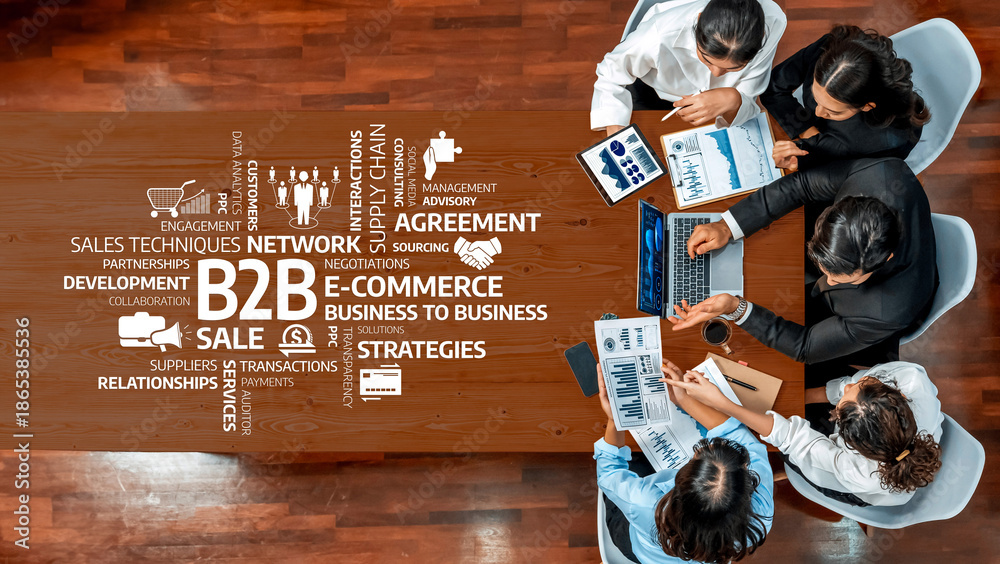 Aerial view of diverse business professionals working together on strategies for B2B sales and e-commerce, discussing data and graphs at a conference table. Amity
