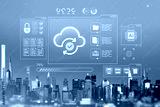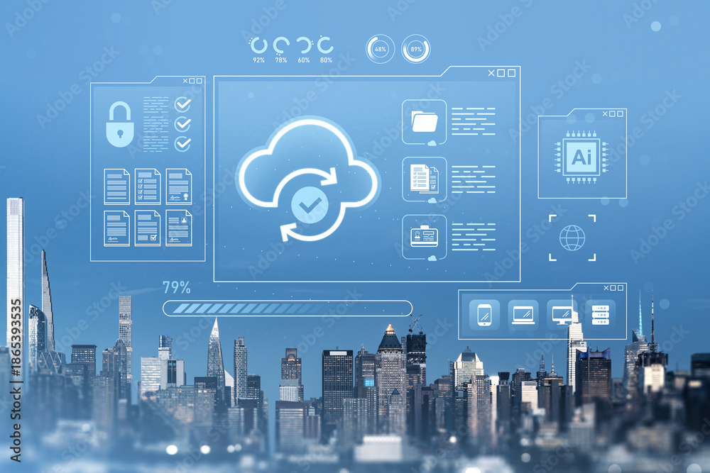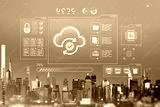 Cloud data storage and cybersecurity hologram interface over Manhattan NYC skyline in futuristic online network technology concept background.