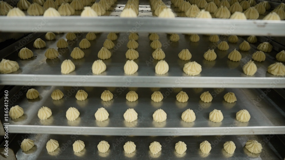 Unbaked cookies on metal trays in a commercial bakery