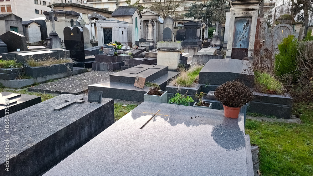Cemetery in Passy Paris with tombstones and greenery in a quiet space during daylight