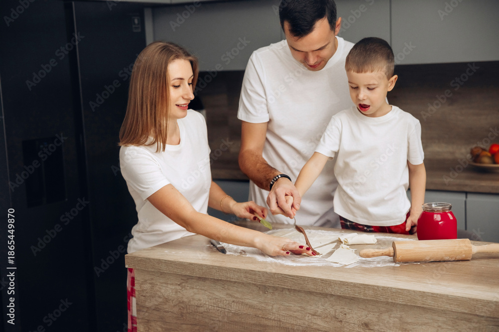 Family makes cookies in kitchen with child helping and parents guiding in cozy family activity during afternoon
