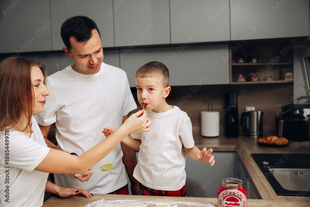 Family making snacks in kitchen during daytime with child tasting food while parents help in home cooking activity