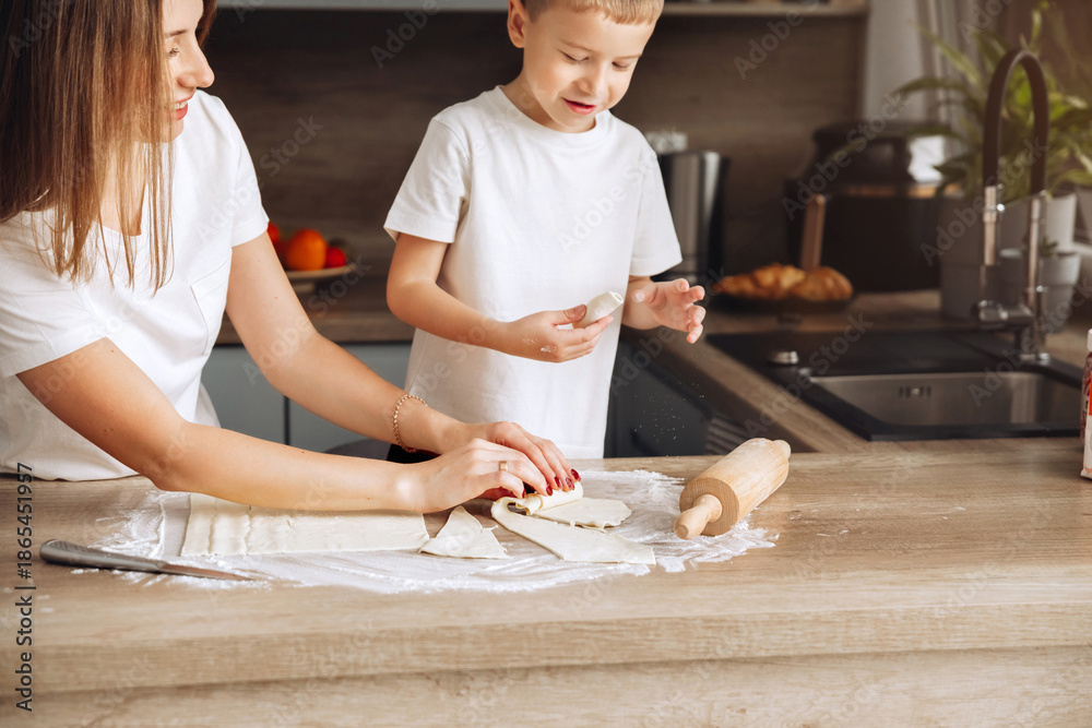 Mother and child prepare dough in the kitchen during a morning baking session while enjoying time together