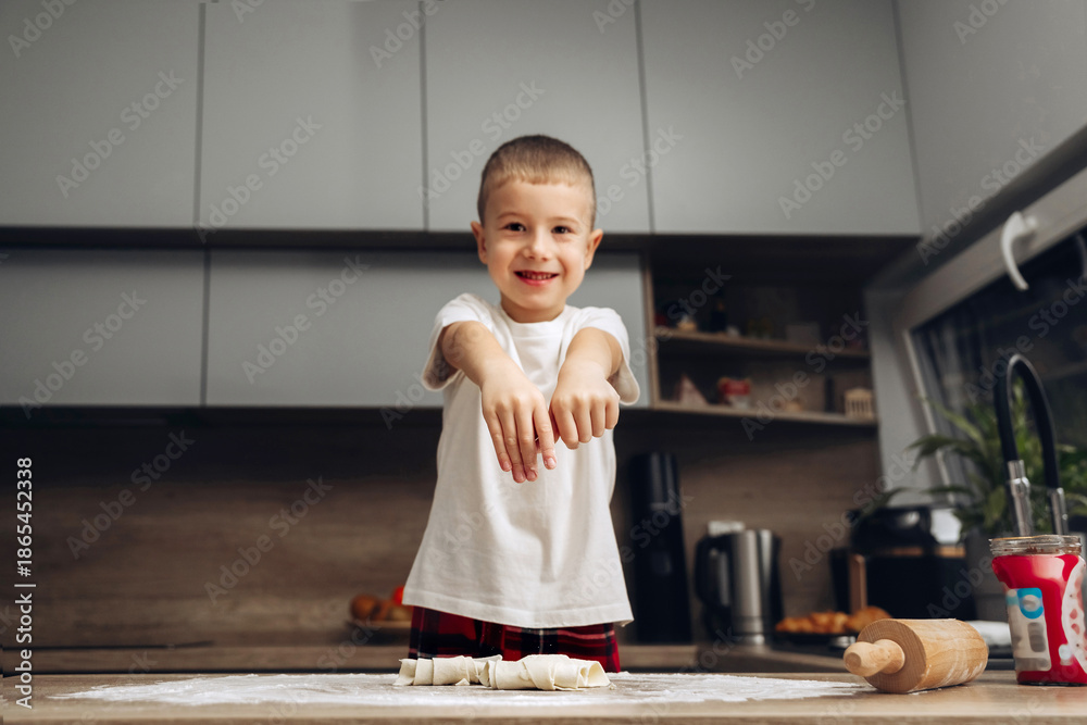 Child makes dough in kitchen with rolling pin and smiles while preparing to cook with hands outstretched towards camera