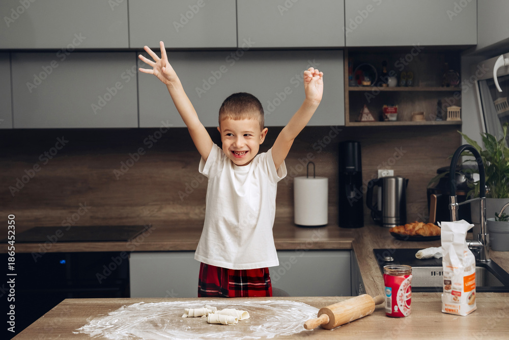 Excited child celebrates while baking in modern kitchen with rolling pin and dough