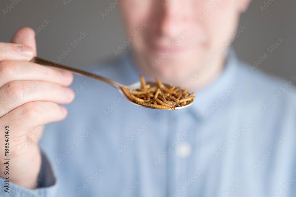 Spoon with dried mealworms over plate, sustainable protein food .Man eating dried mealworms with spoon.Alternative protein, edible insects.Future nutrition and environmentally friendly eating habits.