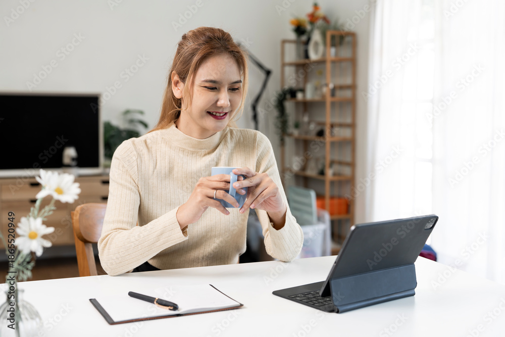 Happy Asian woman using tablet and taking notes in cozy home office. Concept of remote working, online learning and creative workspace.