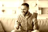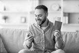 Happy young man holding international passport and plane tickets, using smartphone to book vacation online from home. Millennial guy making web hotel reservation for his overseas trip