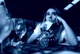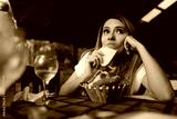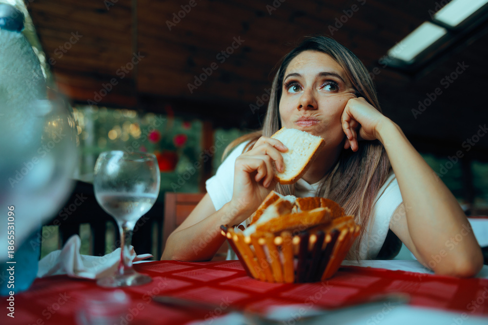 Hungry Woman Eating a Piece of Bread at Restaurant. Starving customer snaking on the free appetizers on the table