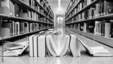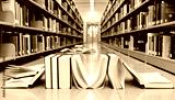 Books Spilling Out of Shelves in Library Aisle