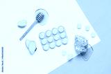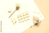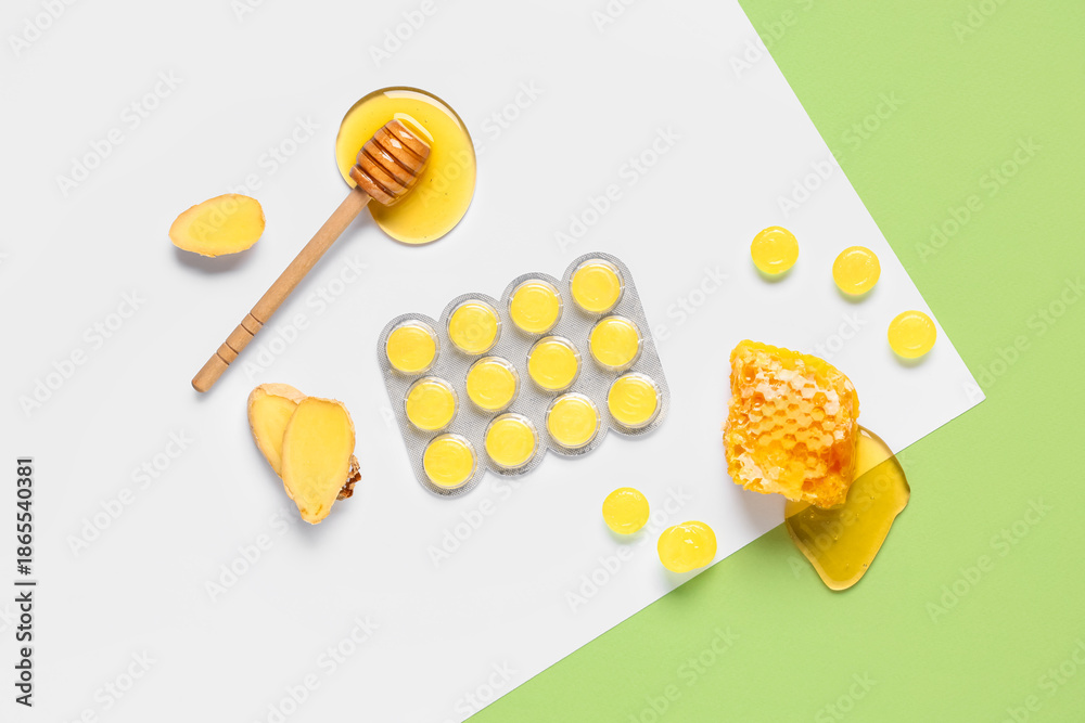 Cough drops in blister with ginger root slices, honeycomb and dipper on color background