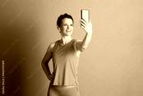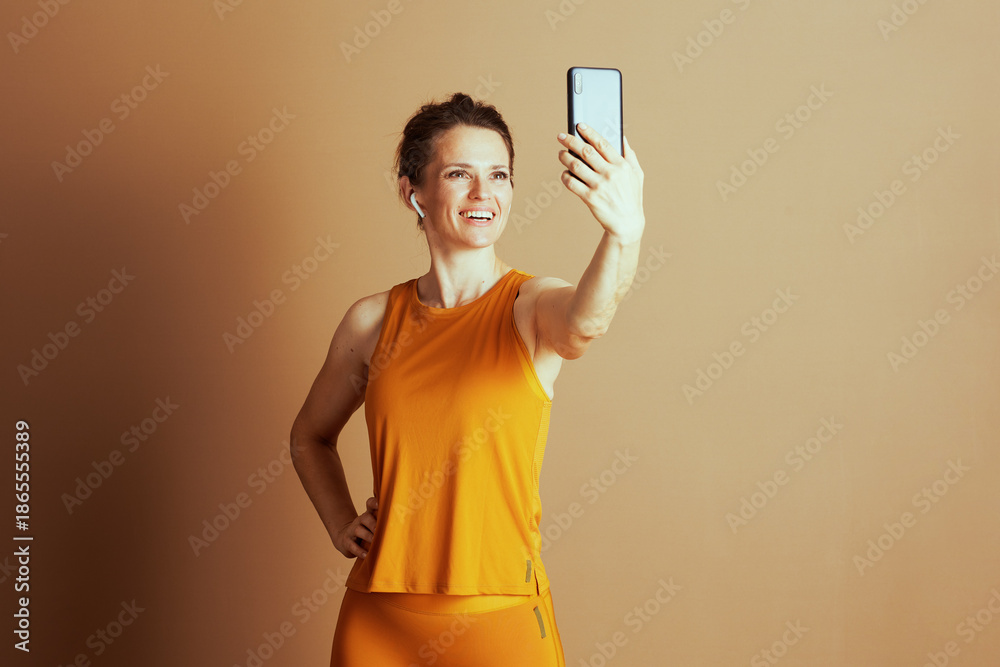 A smiling woman in mustard yellow athletic wear and earbuds extends her arm, holding a smartphone to take a selfie or record. She projects an active, confident, and joyful modern lifestyle.