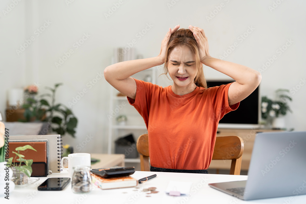 Overwhelmed young Asian woman holding her head in stress while working at a desk with a laptop and bills. Concept of mental burnout, debt, and financial crisis.