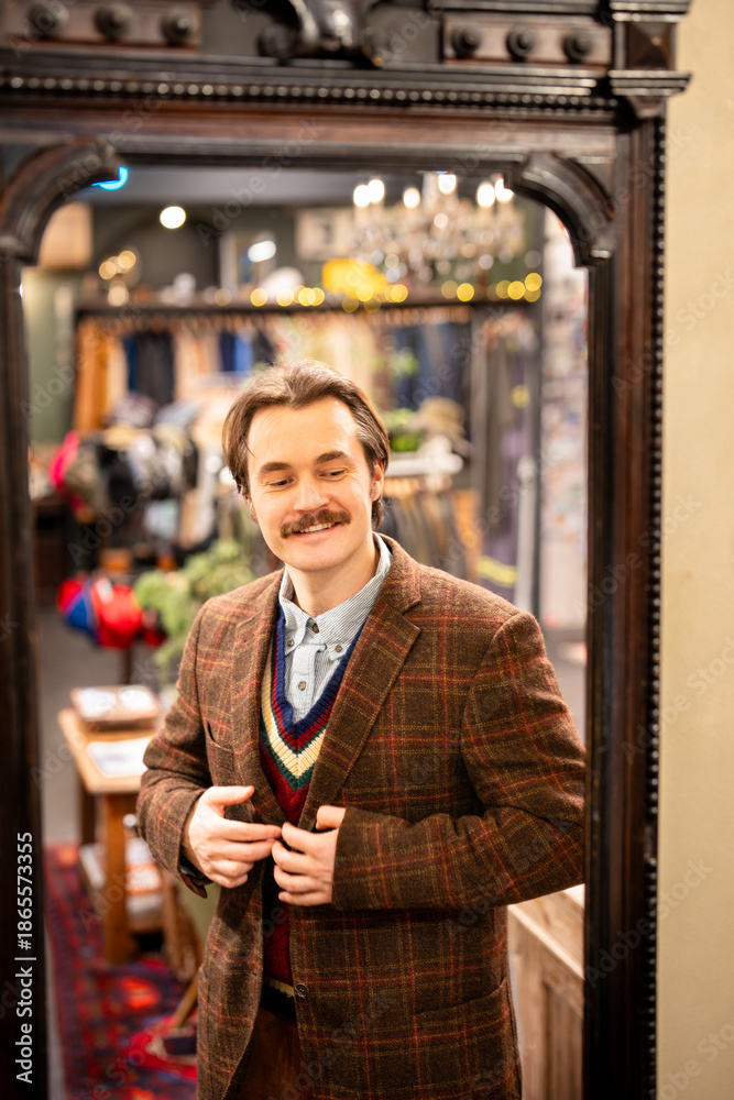 Delighted mustachioed man customer stands in front of mirror in vintage boutique in elegant wool blazer. Cheerful male in fashionable second hand shop smiles in reflection, happy with new clothing.