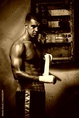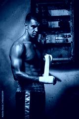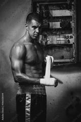 Muscular young man boxer wrapping hand with bandage. Fighter Man concept.