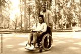 Full length of cheerful black guy taking his impaired girlfriend in wheelchair for walk at city park in autumn. African American disabled couple enjoying fall nature together, outdoors