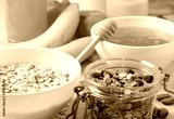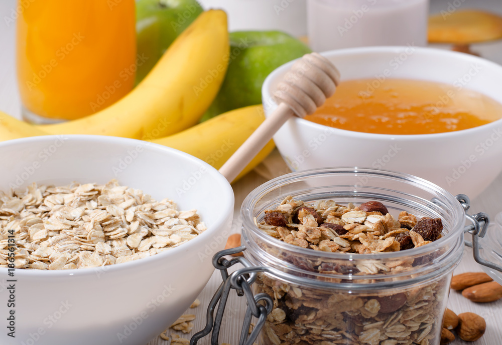 Oatmeal with raisins. Honey, bananas, green apples, nuts