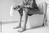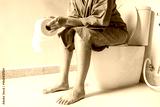 Woman sitting on the toilet bowl in the bathroom. She has stomach ache. Poor digestive system. Constipation. Diarrhea. Food poisoning. Health and medicine.
