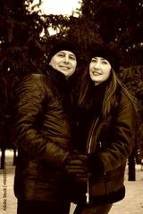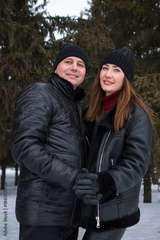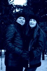 Pair Dressed Warmly Beside Evergreen Background, Two Individuals Wearing Coats And Hats In Urban Setting, Couple Exuding Fashion In Winter Attire With City Vibe And Cozy Atmosphere