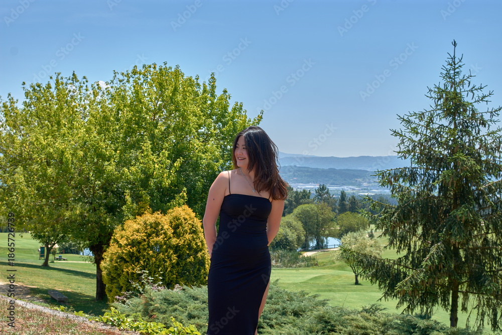 A young woman in a black dress smiles happily as she poses on a sunny golf course surrounded by pine trees and green grass under a blue sky