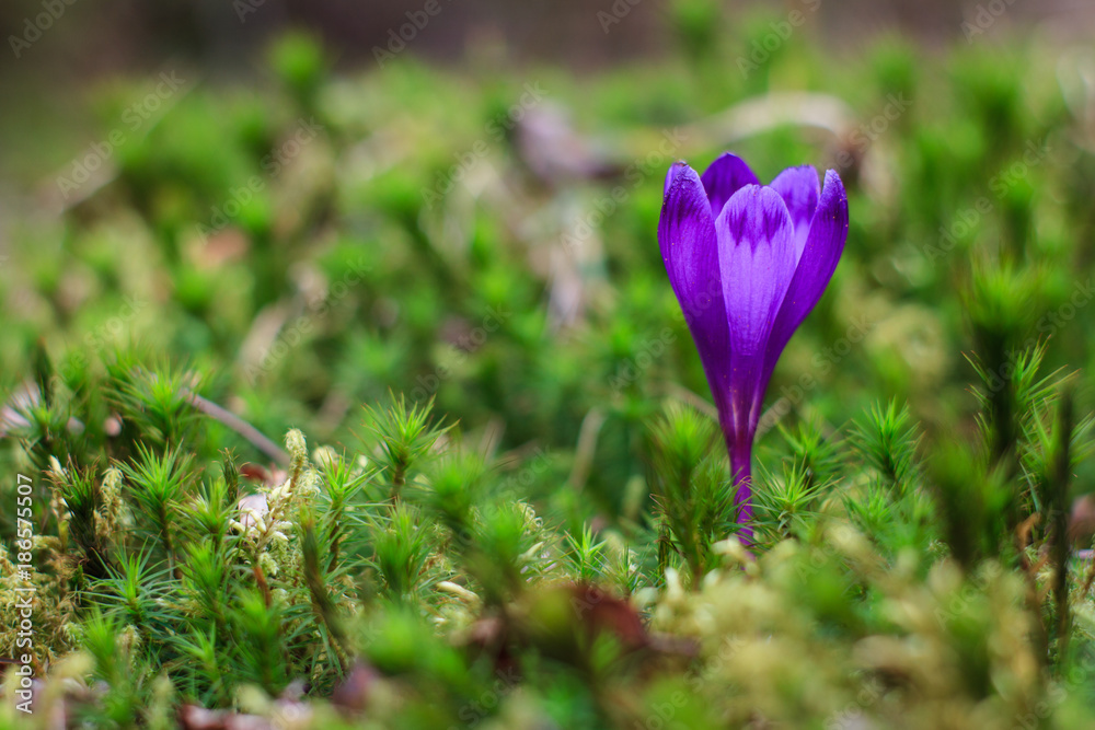 View of close-up blooming violet crocuses among moss and dry foliage. Beautiful first spring flowers. Natural background.