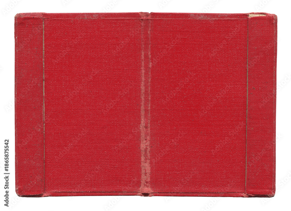 small open notebook vintage red covers with stained and wrinkled buckram canvas cloth isolated on white