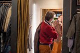 Male customer in men's wear second hand boutique trying on vintage fashionable checkered blazer in front of mirror in open fitting room. Mustachioed elegant man in jumper fits on jacket in shop.