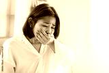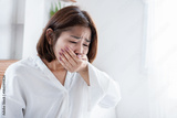 Asian woman feeling nauseous and covering mouth, suffering from morning sickness, food poisoning, Healthcare concept of nausea, vomiting, and early pregnancy symptoms at home