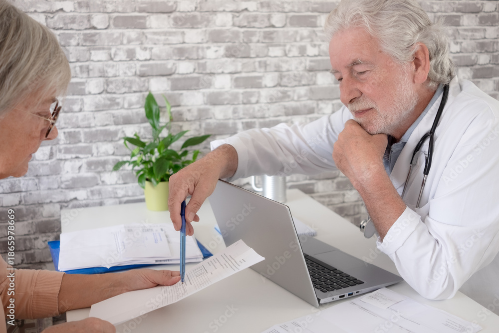 Senior male doctor consulting with elderly female patient in a medical office, reviewing documents at a desk with a laptop. Concept of healthcare, medical consultation, diagnosis, trust, patient care