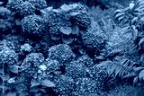 Huge purple hydrangea macrophylla blooms surrounded by lush ferns in garden