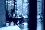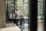 A view through a glass partition shows a modern, busy office interior. Business people are working at desk
