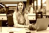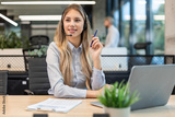 Portrait of happy smiling female customer support phone operator at workplace.
