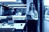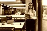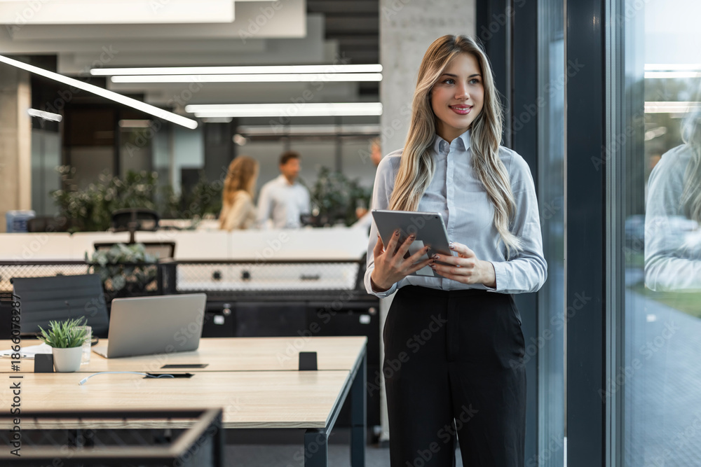 Young elegant business woman standing with digital tablet near office window