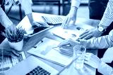Business team analyzing income charts and graphs with modern laptop and digital tablet.