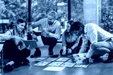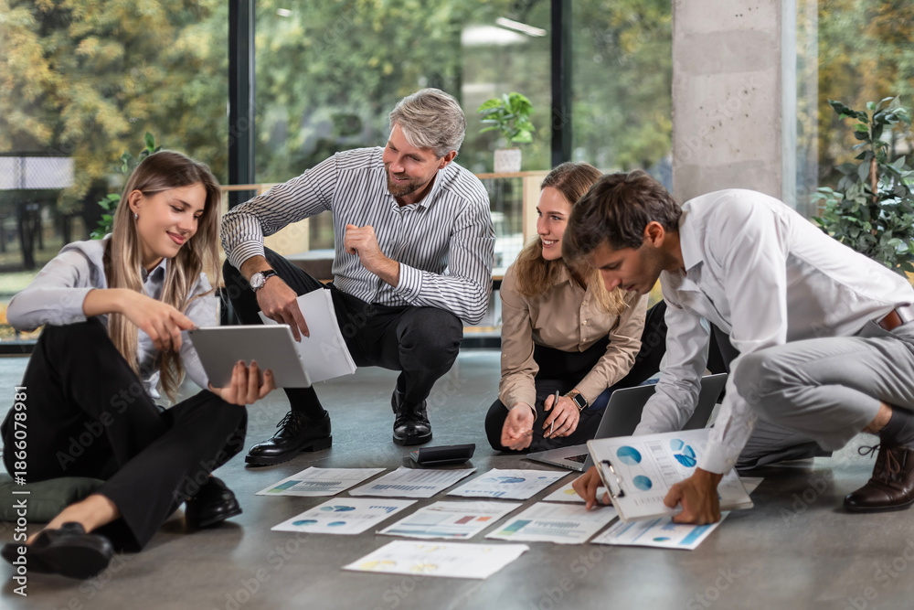Group of young business people working on new project sitting with financial documents spread out on the floor