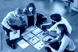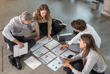 Business people looking at project plan laid out on floor, discussing new project plan in modern office, top view.