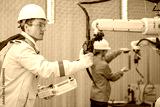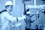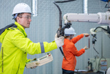 Male Engineer Operating a Robot Arm with a Handheld Controller Automation Engineer Using Teach Pendant for Precision Control Engineer in Safety Gear Checking Robot System Operation.