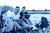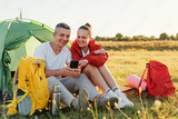 Two people sit outside a tent in a field, looking at a smartphone. They share a moment while surrounded by camping gear under the evening sun